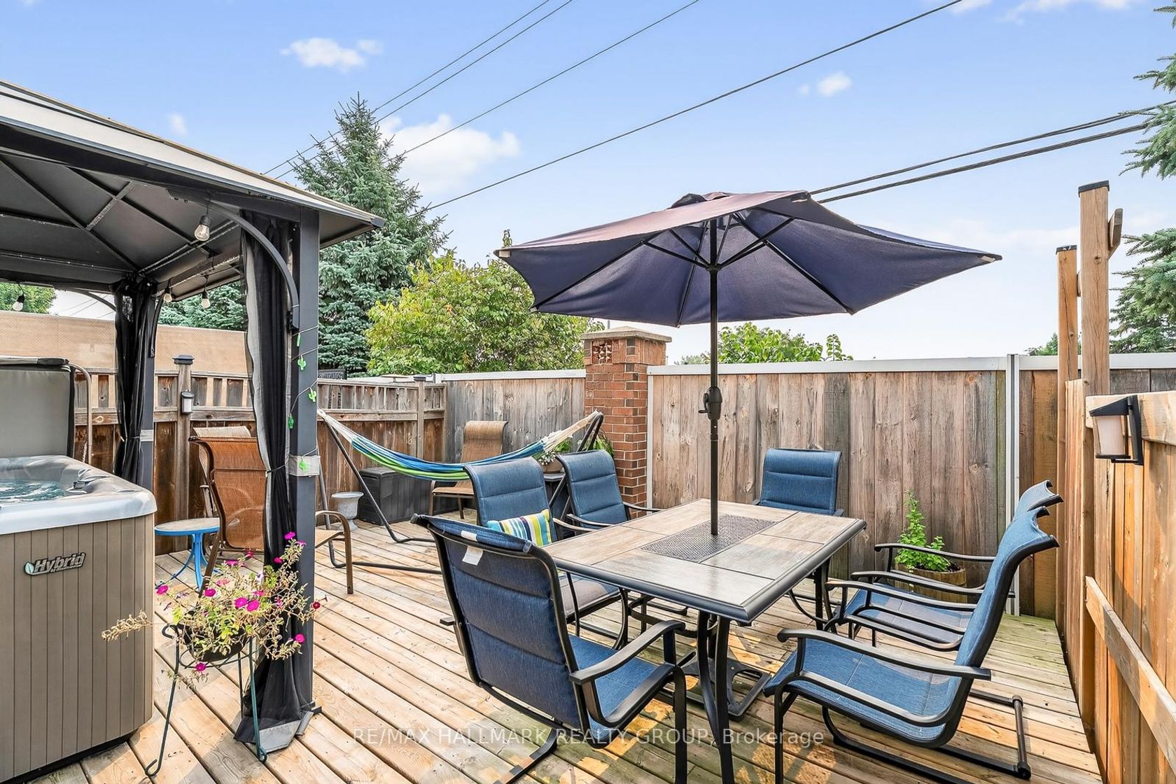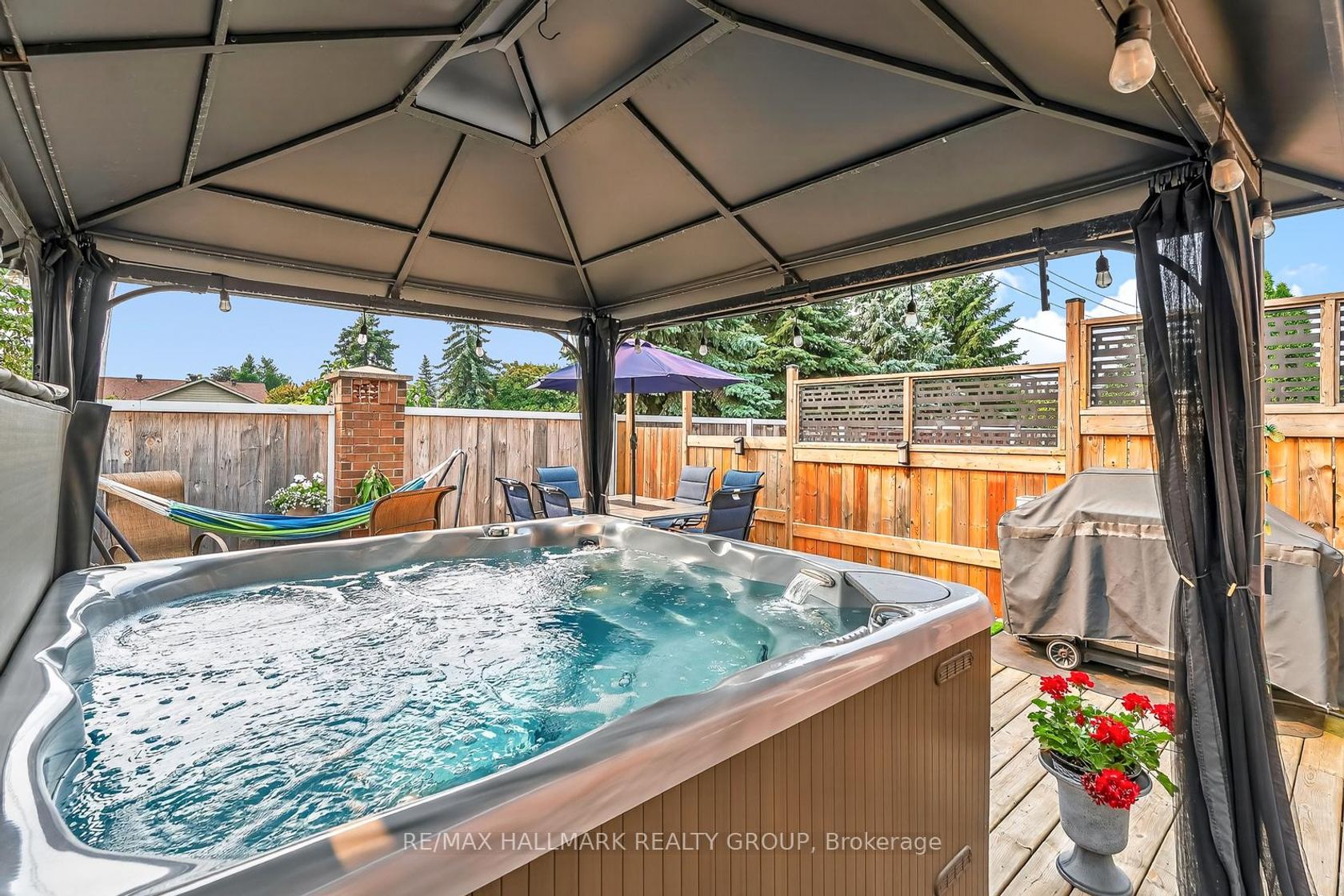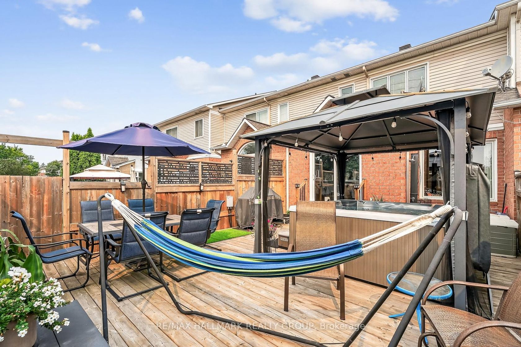 This impeccably maintained 3-bedroom, 3-bathroom row unit offers stylish living with numerous high-end upgrades, including a modern kitchen with quartz countertops, marble backsplash, stainless steel appliances, and task lighting, plus a stunning floor-to-ceiling pantry. The main floor features a dining room, welcoming living room, and a conveniently located powder room. Step outside to a maintenance-free backyard oasis, fully decked and fenced, featuring a 7-person Beachcomber hot tub, gazebo, and natural gas BBQ line - perfect for entertaining. Upstairs boasts spacious bedrooms, including a 3-piece ensuite in the principal bedroom, while the lower level offers a bright family room with high ceilings, laundry, and ample storage. Major upgrades within the last 15 years: patio door, front door, windows, shingles & ice shield, high-efficiency gas furnace, central air, garage door & opener. This home blends comfort, quality, and convenience in every corner!