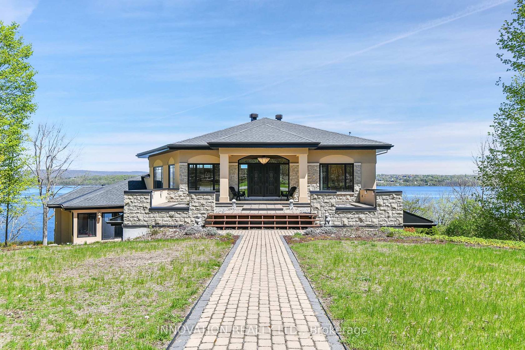 EXCEPTIONAL RIVERFRONT PROPERTY Perched safely above the Ottawa River this substantial highly customized home is designed to capture breathtaking views with private river access. Very private 1.59 acre property with 200ft riverfront. 180 degree views up & down river with fabulous city skyline vistas to the east. 4960 sqft of living space above grade plus over 2000 sqft finished space in the walkout lower level. Unassuming entry loft level opens to large open concept space as you descend the stairs giving an indication to the scale of this home. Artisan built natural stonewalls respect the rocky terrain. Customized at every corner & curve each space takes advantage of walls of windows to feature views of river & Gatineau Hills and the customized gardens all around the property. Great Rm has lofty ceilings w/skylights, fireplace, and circular staircase to the Recreation Room below. Kitchen is central to Dining & Family Rm. This well equipped Kitchen is perfect for entertaining. Very large Dining Room is accented by natural stone walls and arches. Family Room next to the Kitchen offers lovely garden views with afternoon sun & a fireplace. Spa space offers hot tub, sauna, rain shower + bathroom. Primary Bedroom suite has it all: corner windows w/views of the city skyline, deck, sunken Library, 5pc Ensuite & spacious Walk-in. 2 main level secondary Bedrooms each have Walk-ins, 3 piece Ensuites & loft spaces accessed by spiral stairs. Finished walkout lower level provides for a 2nd Family Room with a bar, Recreation Room, Media Room, 2 additional Bedrooms, a 3 piece Bathroom, and another Office. There is also a workshop, two utility rooms, and several storage areas. Extensive landscaping w/rock gardens, Trex decks, stairs to rocky shore & dock. Rare offering. 4 bay drive through garage. Generac generator for automatic transfer to the whole home if Hydro goes out. Located in Rural Kanata North along millionaires row, just minutes to many amenities.