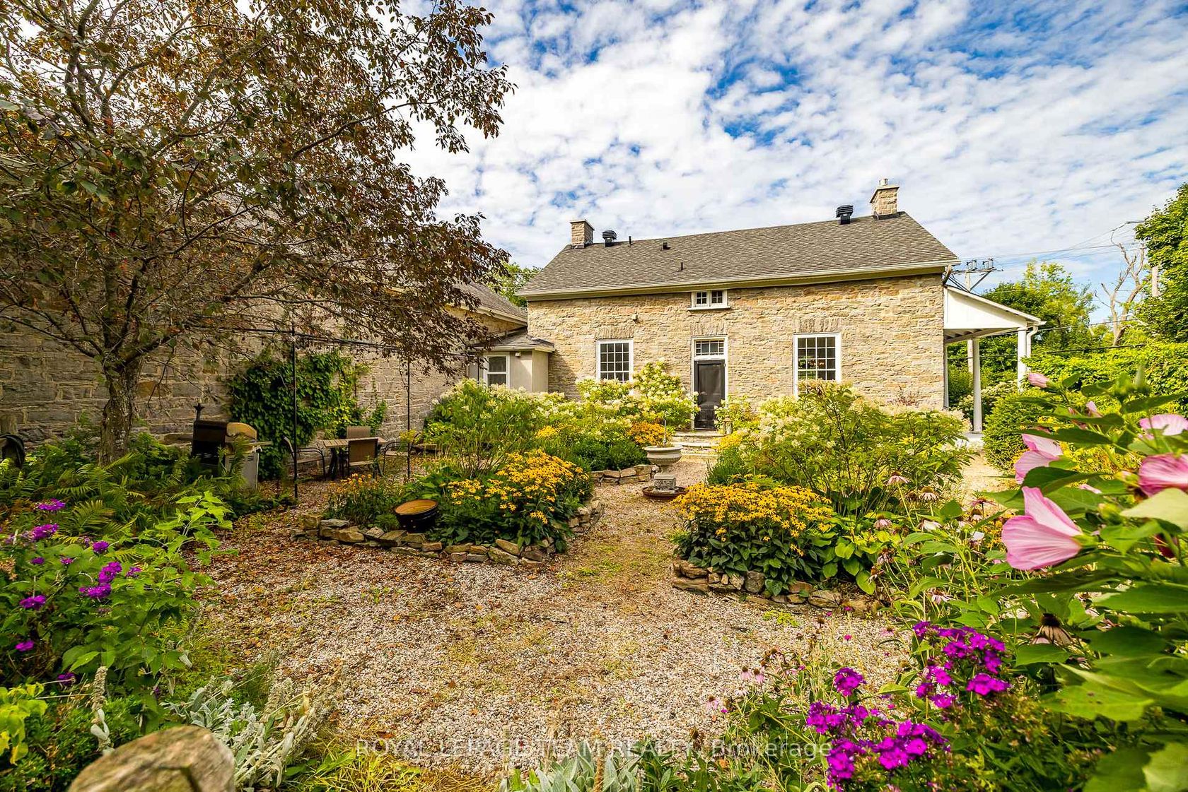 OPEN HOUSE SUNDAY JAN 25th 2-4PM. Nestled in the picturesque town of Appleton, this breathtaking stone home sits on 1.4 acres of gorgeous grounds directly across from the Mississippi River. Steeped in history and charm, it showcases original hardwood floors, soaring ceilings, deep window sills, and intricate period details that create a timeless sense of elegance. The primary suite above the kitchen, complete with an ensuite, makes this home ideal for large families. The main residence offers three additional bedrooms, a spa-inspired bathroom, a formal dining room, living room, office, and cozy sitting room, all complemented by generous storage throughout. The heart of the home is the eat-in kitchen, featuring stainless steel appliances, soapstone counters, and a gas fireplace that once served as the original cooking hearth and bake oven. From here, a breezeway connects seamlessly to the main living areas. Modern updates include 200-amp electrical service, offering peace of mind and flexibility for today's lifestyle. Enjoy peaceful mornings listening to the river rapids from the wrap around covered verandah, or unwind with a book in the enchanting English cottage garden. A newly added loft space above the garage offers even more versatility; perfect for extra storage, a studio, or a creative retreat. Lovingly maintained and thoughtfully updated, this rare gem combines old-world charm with modern comfort. Ideally located just minutes from Carleton Place and Almonte, with easy highway access for a short commute to Kanata and downtown Ottawa.