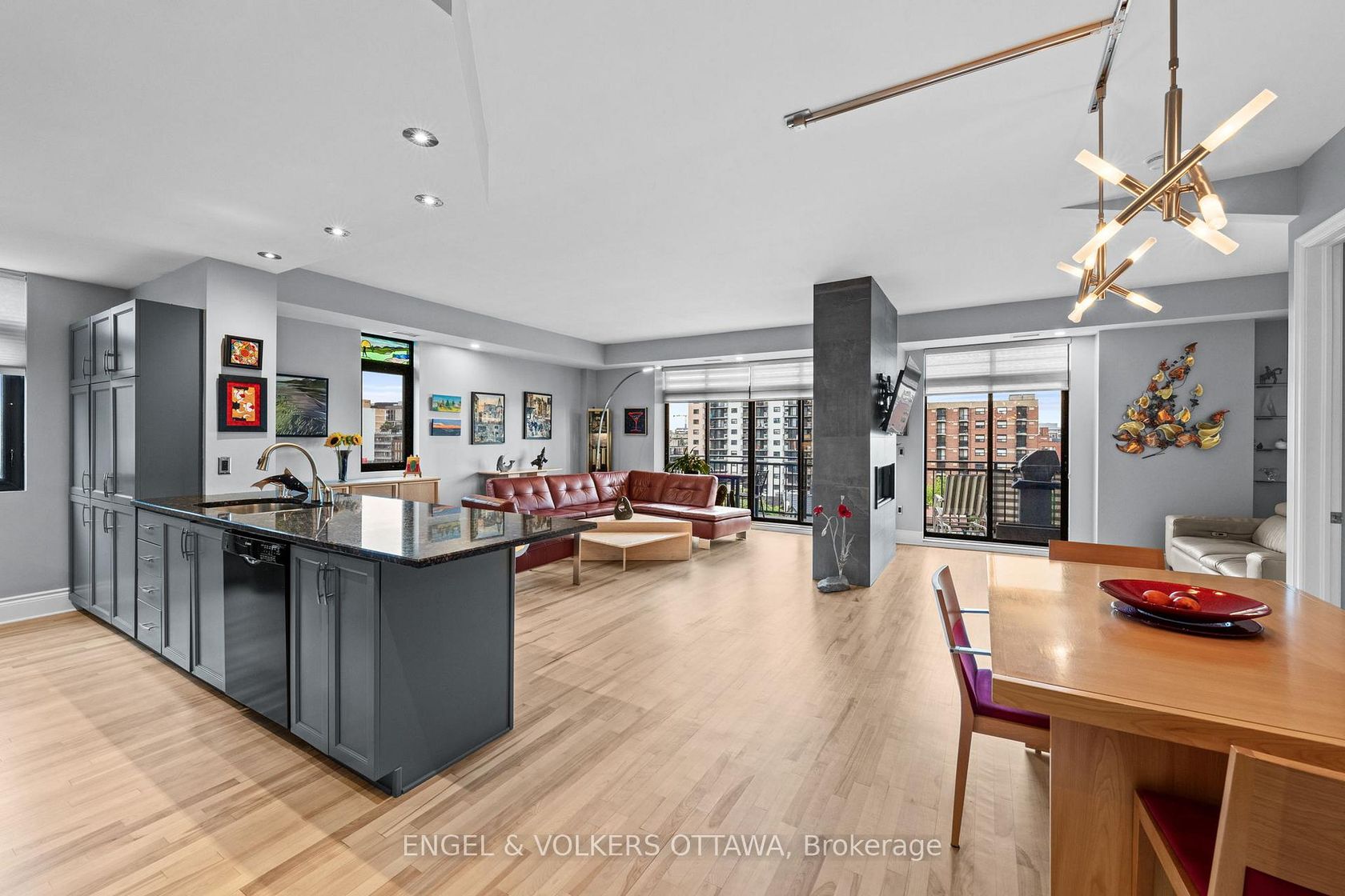 Welcome to 1,492 sq. ft. of open-concept luxury living in the heart of Ottawa. Built by the award-winning Domicile Developments, this spacious 2-bed, 2-bath condo combines modern upgrades, premium finishes, and unbeatable convenience just steps to shopping, dining, transit, parks, and entertainment. Enjoy light hardwood floors throughout and floor-to-ceiling south-facing windows that fill the home with natural sunlight. The expansive living room features a striking 2-sided natural gas fireplace, flowing into a versatile den with custom Hunter Douglas blinds. The dining space offers flexible configurations, while the chef-inspired kitchen includes ample counter space, a GE induction stove, Fisher & Paykel stainless steel fridge, and a whisper-quiet Bosch dishwasher. The large primary bedroom fits a king bed with ease and boasts custom blackout shades, decorative sliding doors, a walk-in closet with custom built-ins, and a renovated ensuite with a separate shower. The second bedroom currently an office features a beautiful custom wood wall unit. The main bath has been completely modernized with a sleek stand-up shower. Step out to your private balcony with southern views and a natural gas hookup for year-round BBQing. Included: premium parking (extra space beside), storage locker, and access to the Commons Patio. Well-managed building no special assessments, none planned. Flexible closing available. Perfect for professionals, down sizers, or anyone seeking upscale, maintenance-free living in Ottawas most connected location.