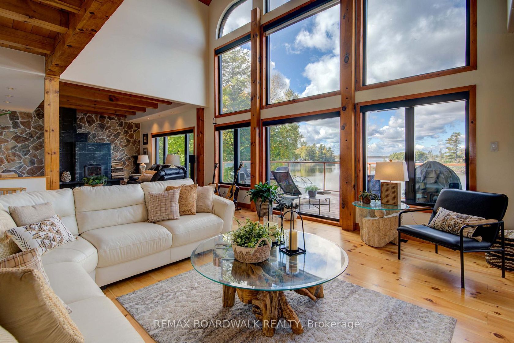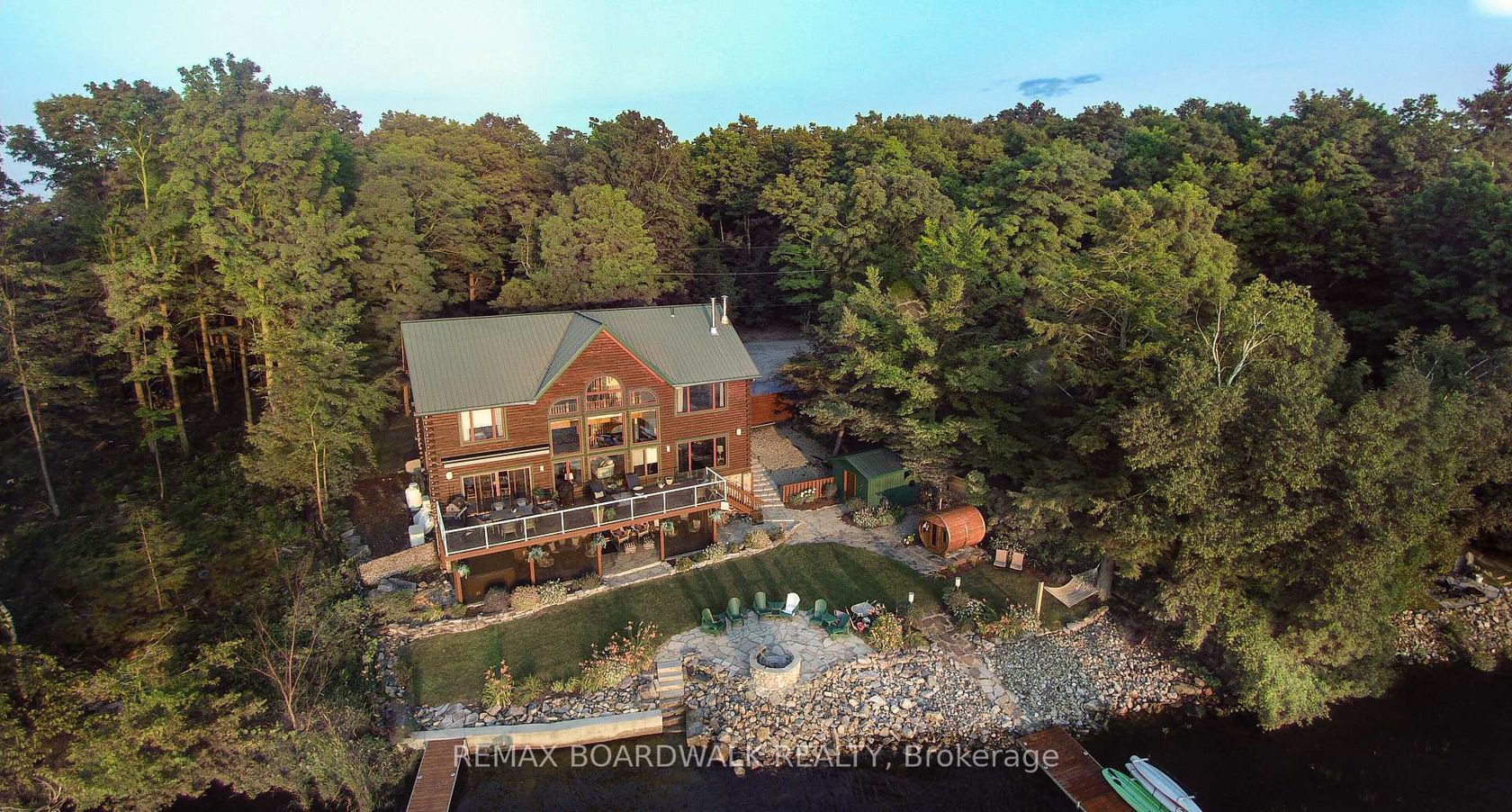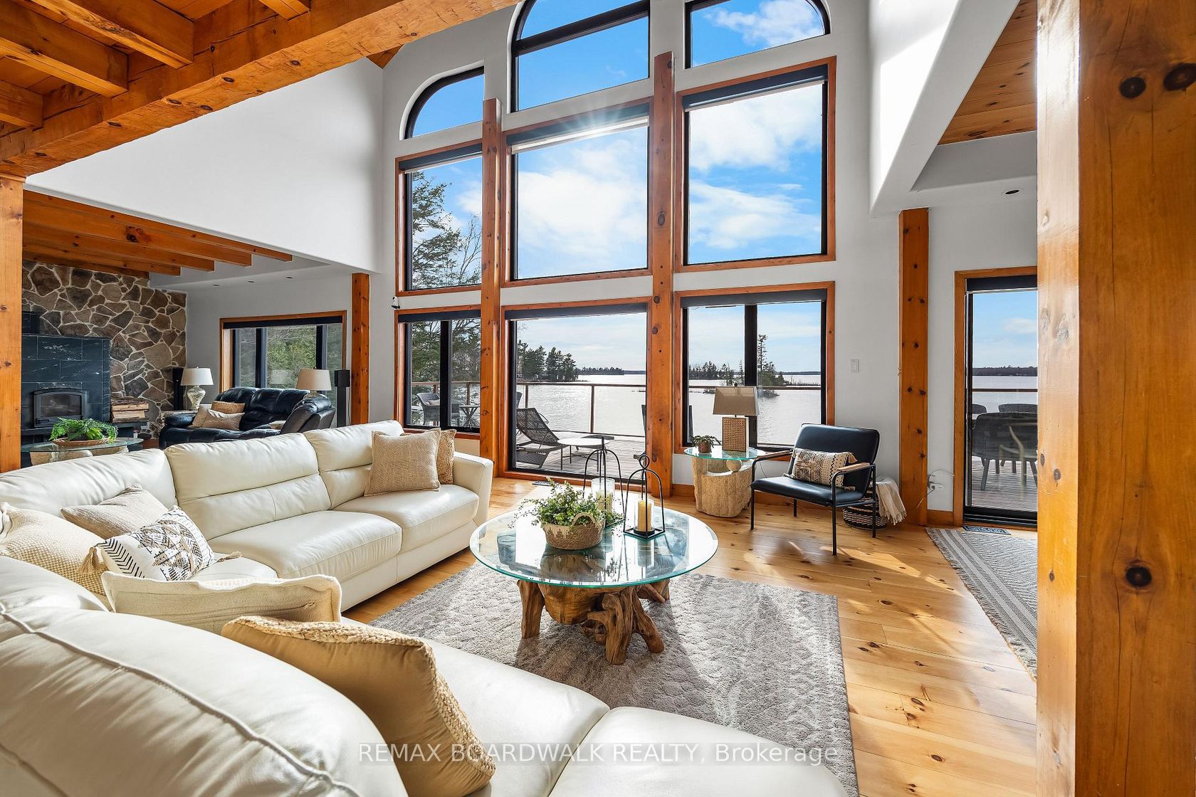 WELCOME TO LAKE LIVING, boasting arguably the most breathtaking westerly views and pristine shoreline the lake has to offer. Outside, you'll find over 100 feet of private waterfront, featuring your own sandy beach, stunning shoreline, two docks, a floating raft, a sauna, hot tub, and a custom bonfire all designed to captivate lake vistas. As you step inside, the home exudes luxury and pride of ownership. Souring ceilings, expansive floor-to-ceiling windows throughout provide panoramic views of the lake from nearly every room. The custom chef's kitchen is a dream, featuring top-of-the-line appliances, a wine fridge, ample cabinetry, and generous counter space, all centered around a spacious island ideal for family gatherings and entertaining. The home offers four bedrooms on the upper level, including a lavish primary suite complete with a stunning ensuite. With four bathrooms in total, there's plenty of space for comfort and privacy. The fully finished lower level is a true highlight, offering walkout access to a screened-in patio that lets you soak in the peaceful lake views. This turnkey home is ready for you to enjoy the unparalleled lifestyle that waterfront living offers. Whether you're cooling off in the water, boating, fishing, or playing ice hockey in the winter, this property is a true gem, an exceptional opportunity not to be missed. $50/month in road fees.