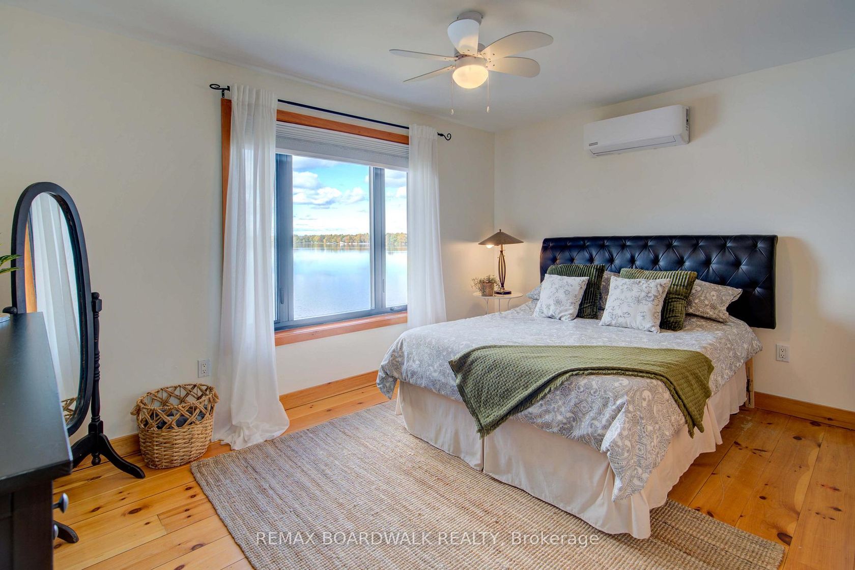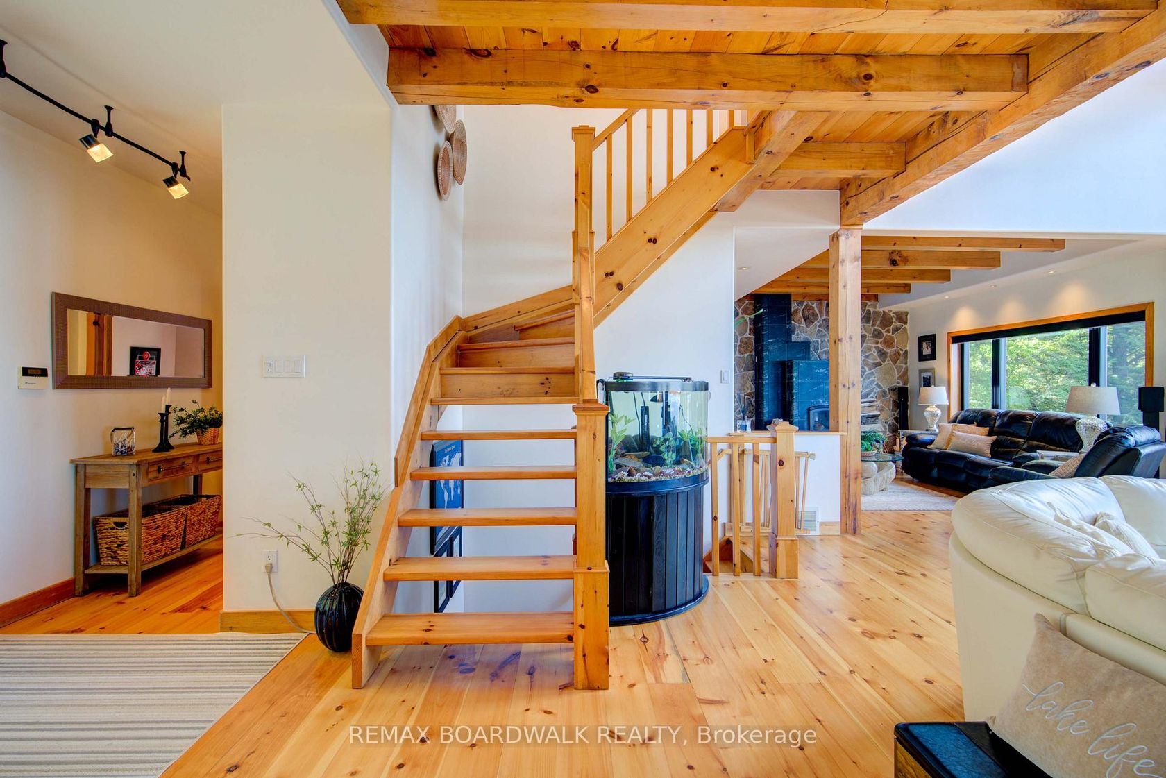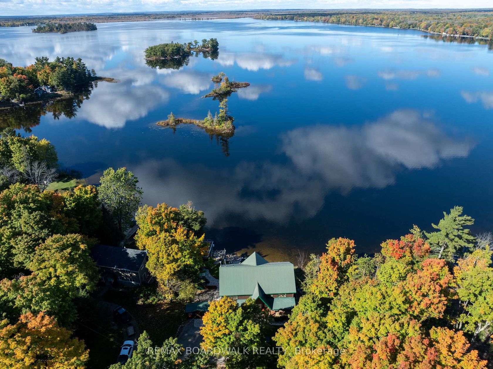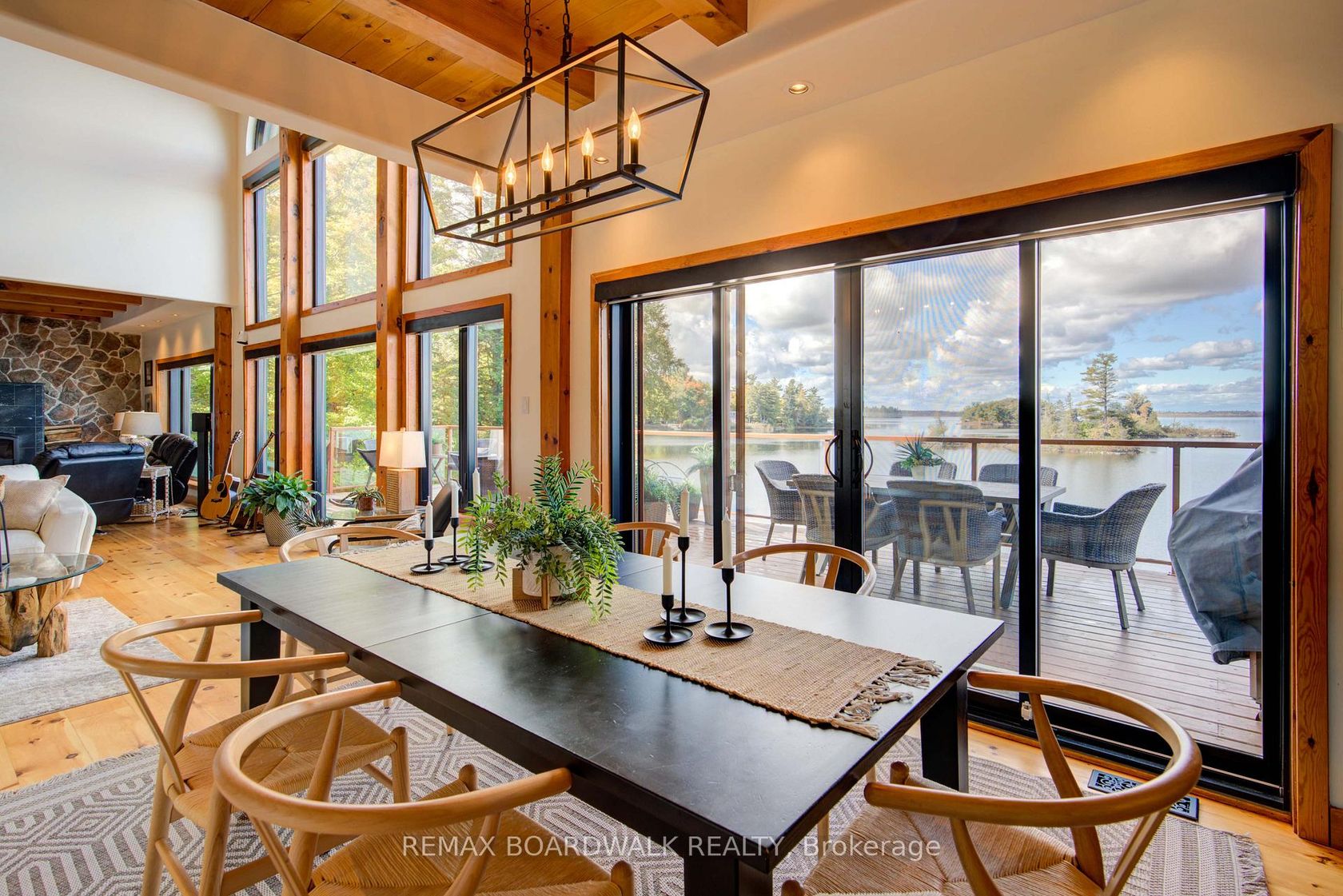 WELCOME TO LAKE LIVING, boasting arguably the most breathtaking westerly views and pristine shoreline the lake has to offer. Outside, you'll find over 100 feet of private waterfront, featuring your own sandy beach, stunning shoreline, two docks, a floating raft, a sauna, hot tub, and a custom bonfire all designed to captivate lake vistas. As you step inside, the home exudes luxury and pride of ownership. Souring ceilings, expansive floor-to-ceiling windows throughout provide panoramic views of the lake from nearly every room. The custom chef's kitchen is a dream, featuring top-of-the-line appliances, a wine fridge, ample cabinetry, and generous counter space, all centered around a spacious island ideal for family gatherings and entertaining. The home offers four bedrooms on the upper level, including a lavish primary suite complete with a stunning ensuite. With four bathrooms in total, there's plenty of space for comfort and privacy. The fully finished lower level is a true highlight, offering walkout access to a screened-in patio that lets you soak in the peaceful lake views. This turnkey home is ready for you to enjoy the unparalleled lifestyle that waterfront living offers. Whether you're cooling off in the water, boating, fishing, or playing ice hockey in the winter, this property is a true gem, an exceptional opportunity not to be missed. $50/month in road fees.
