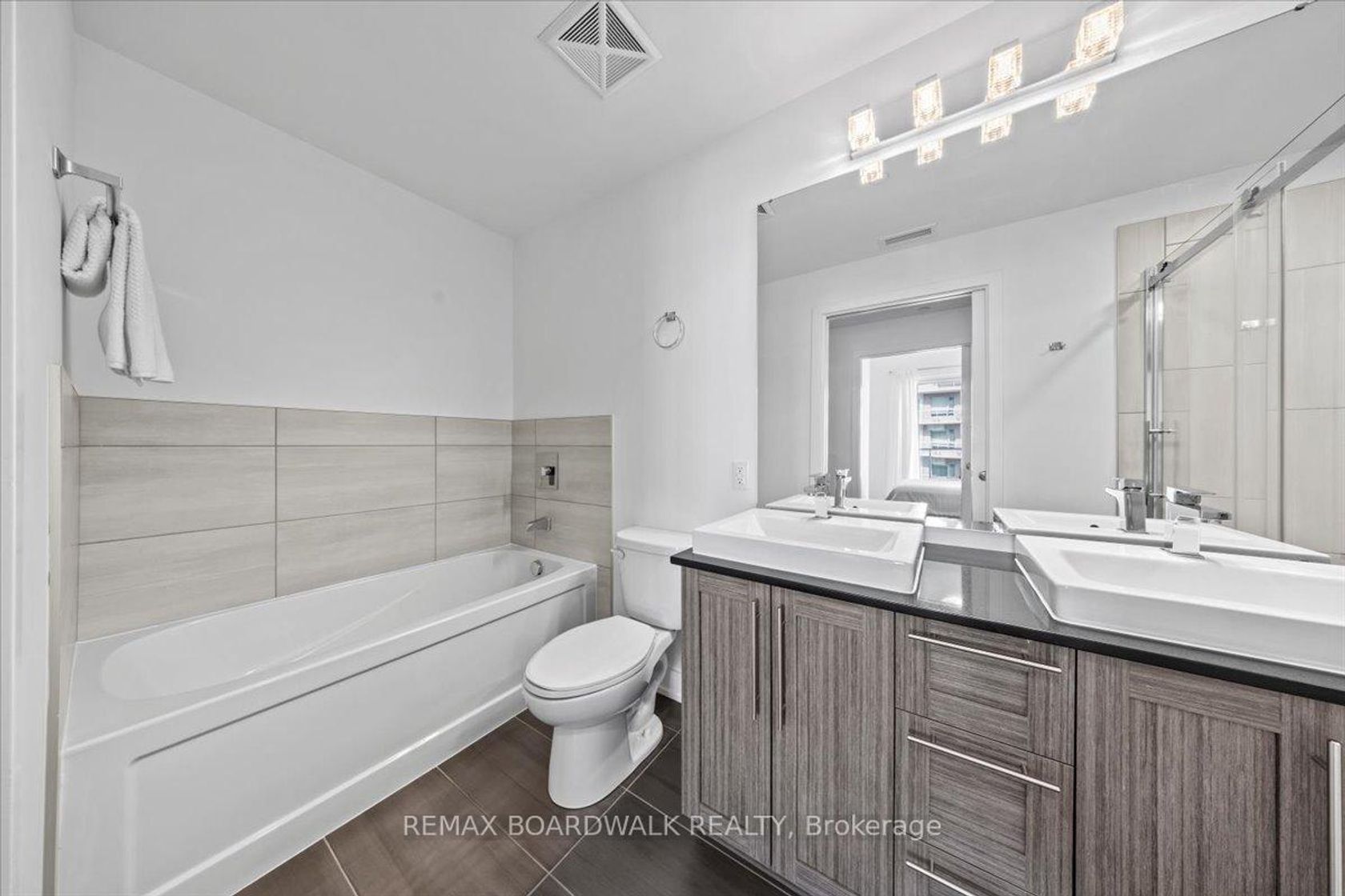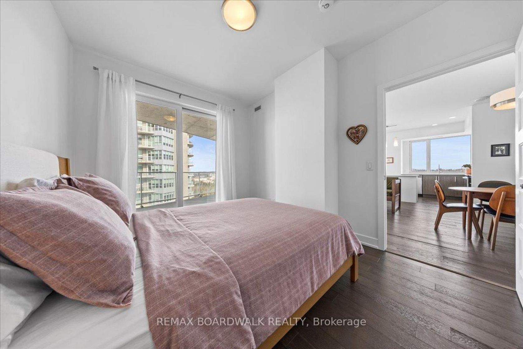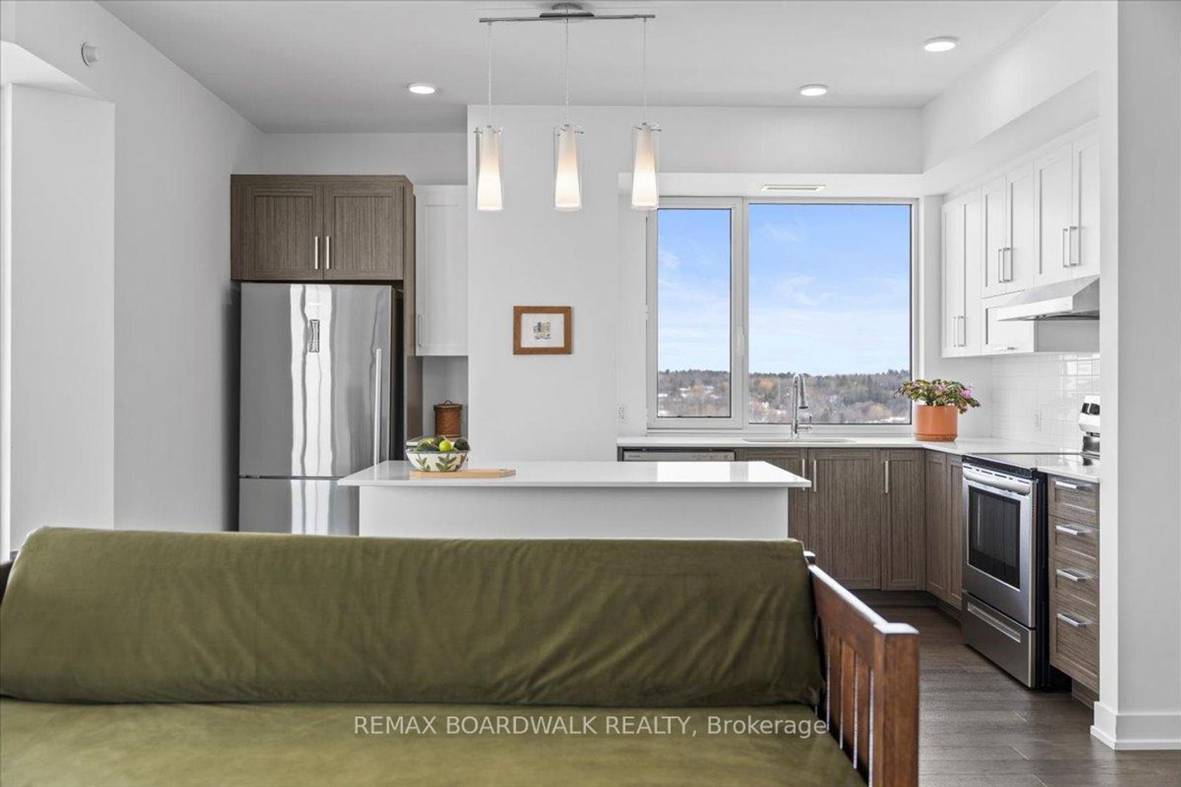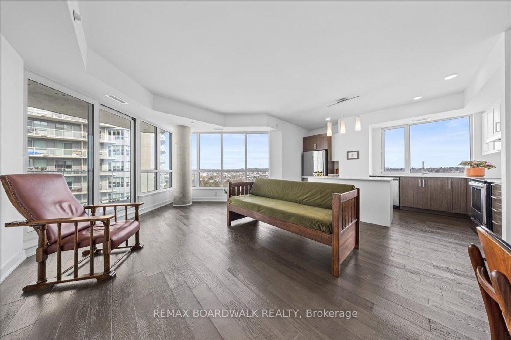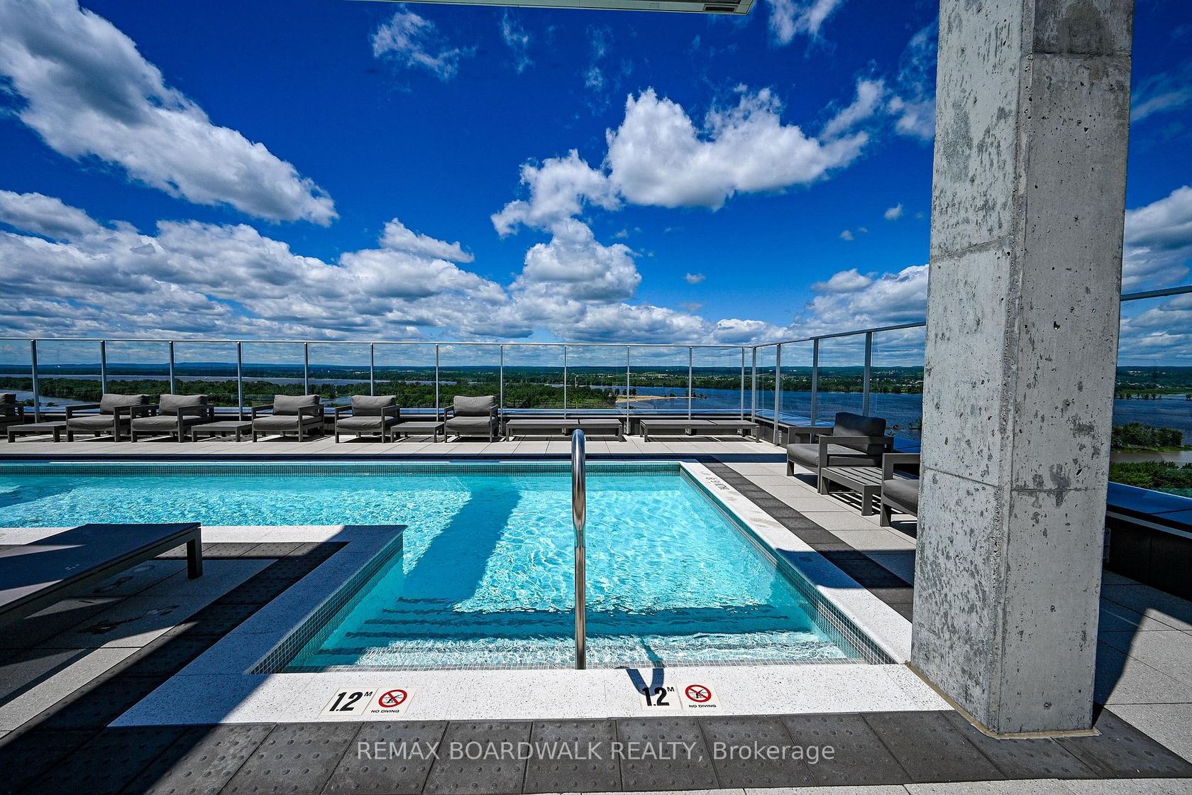 Architecturally composed corner residence w/dual covered balconies, southern exposure, & elevated Ottawa River views. This two-bedroom suite is thoughtfully designed for both form & function, offering refined materials & intentional spatial flow, 37.5" wide entry door introduces a welcoming foyer w/closet storage, setting a tone of accessibility & understated sophistication. Wide-plank engineered hardwood & oversized ceramic tile run throughout, complemented by flat ceilings, boxed baseboards, recessed pot lighting, & modern five-panel interior doors, centre-island kitchen anchors the living space w/quartz surfaces, breakfast bar seating, pot drawers, & two-tone shaker cabinetry w/integrated garage feature. A recessed double sink positioned beneath an oversized window captures natural light & river vistas. The living room's corner glazing frames panoramic water views & morning sun, while the dining area integrates a walk-in pantry for seamless entertaining, primary suite is designed as a private retreat w/its own patio door, walk-through double-sided closet, & a five-piece ensuite featuring twin vanities & a glass-enclosed shower w/rain head & European wand. The second bedroom offers a private balcony, walk-in closet, & pocket-door access to a three-piece cheater ensuite w/double-wide shower, allowing flexibility for guests or workspace, full-size laundry, a separate storage locker, & the rare inclusion of two underground parking spaces enhance livability & long-term value. Residents enjoy curated amenities including a fitness studio w/sunset views, an elegant lounge, rooftop pool, hot tub, & outdoor terrace w/BBQ area. All positioned to embrace the natural landscape of the Ottawa River. A residence defined by light, proportion, & elevated riverside living. 24 hour irrevocable on all offers.
