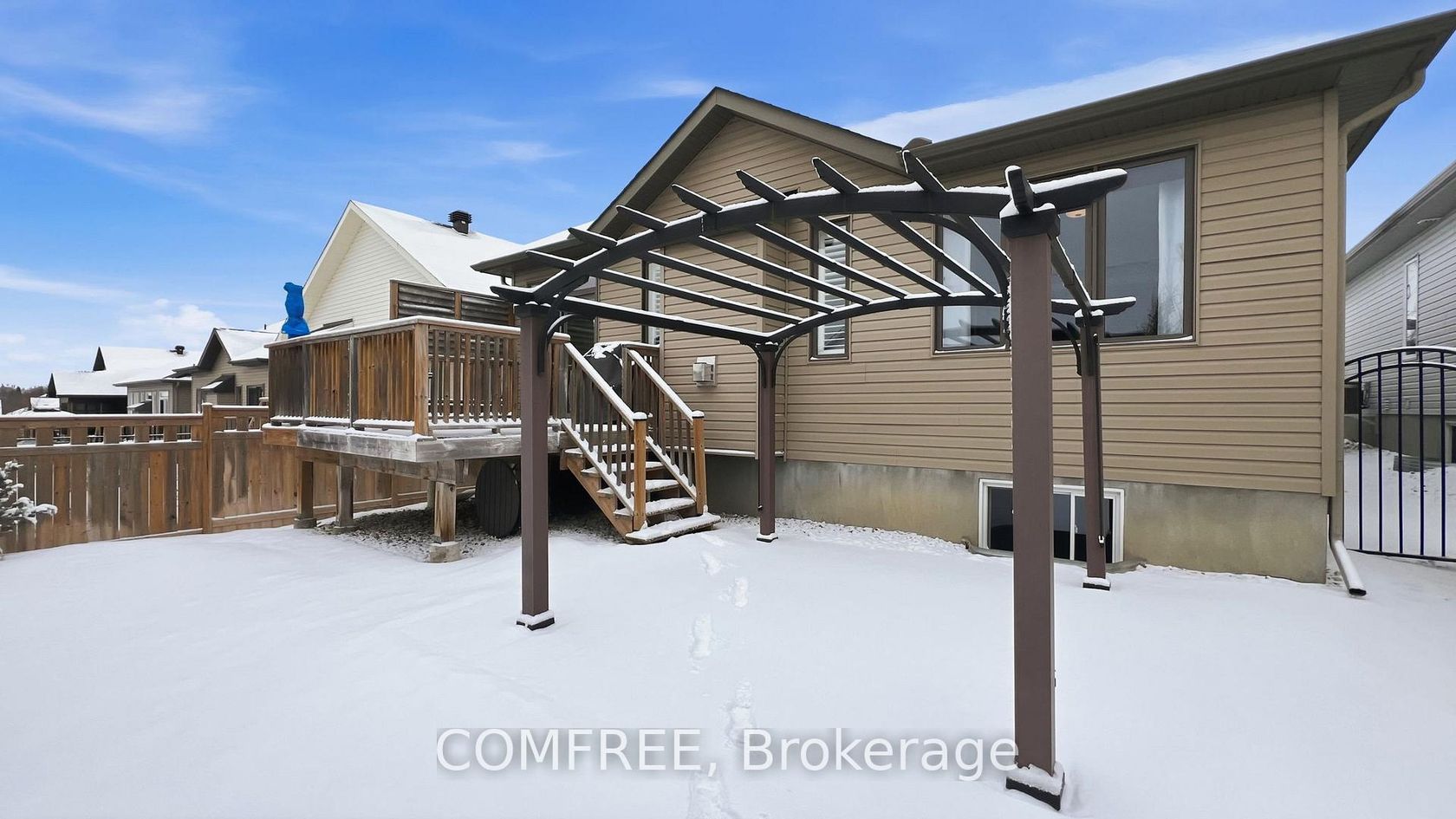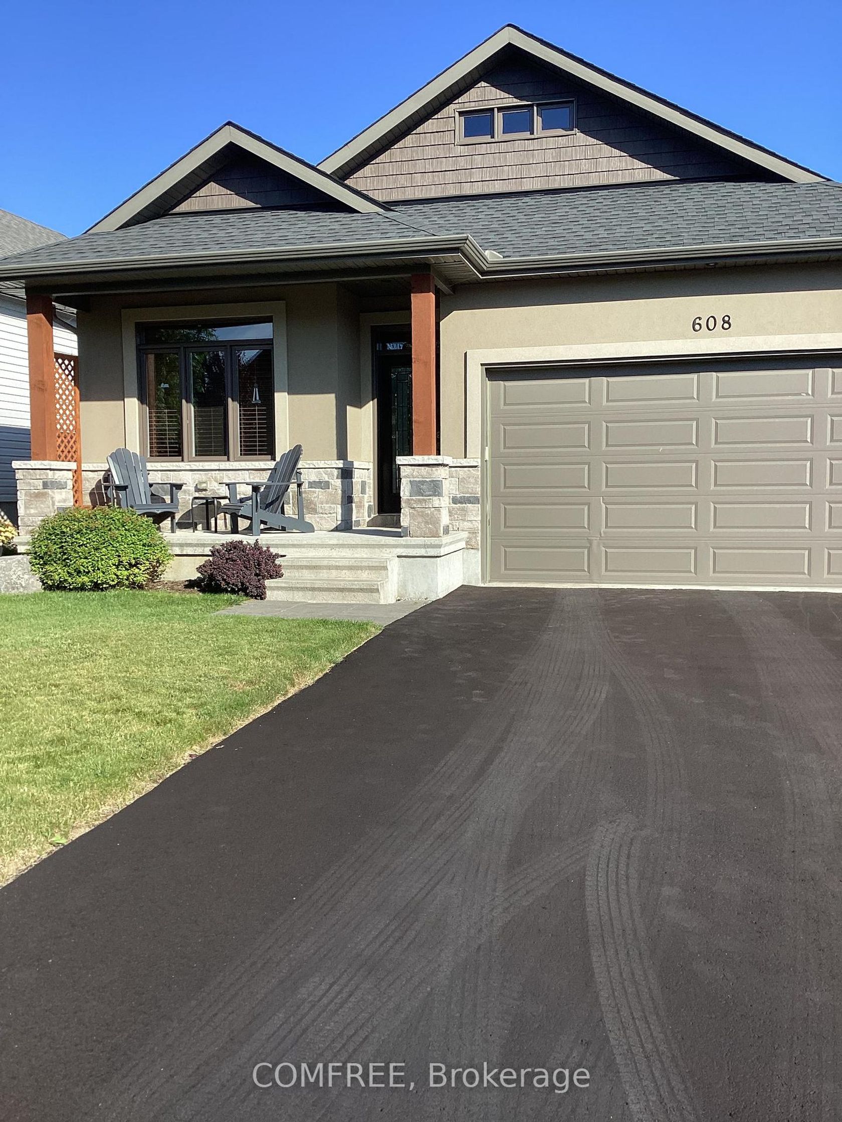 Welcome to 608 Robert Hill Street located in the Riverfront Estates area of Almonte. The Mississippi River and Riverfront Park are just steps away so you can easily walk your kayak or canoe to the dock. Historic Mill Street, the Almonte General Hospital, schools and shopping are all within walking distance. The exterior of the home is stone, stucco and vinyl siding. It has a double car garage, covered porch and parking for 4 cars on the driveway. A good sized deck has steps down to a pergola covered patio. The backyard is fenced and has many Moffatt blue juniper trees. Lawn areas have Hunter/Hydrawize irrigation. This former Doyle/Inverness 1,500 sq ft model home is significantly upgraded. Hardwood plank flooring is throughout the home except for the carpeted stairs to the unspoiled basement and porcelain tiled bathrooms, foyer and laundry room floors. The open concept has an impressive kitchen with a huge quartz island and large number of cupboards as well as a pantry. The dining room is spacious, has plenty of light with a patio door leading to the deck. A vaulted ceiling with pot lights, stone gas fireplace and white mantel highlight the living room space. There are 3 bedrooms. The primary has a walk in closet and ensuite bathroom with separate tiled shower, free standing tub and 2 under mount sinks. A 4-piece bathroom is between the 2 other bedrooms. This home is move in ready.