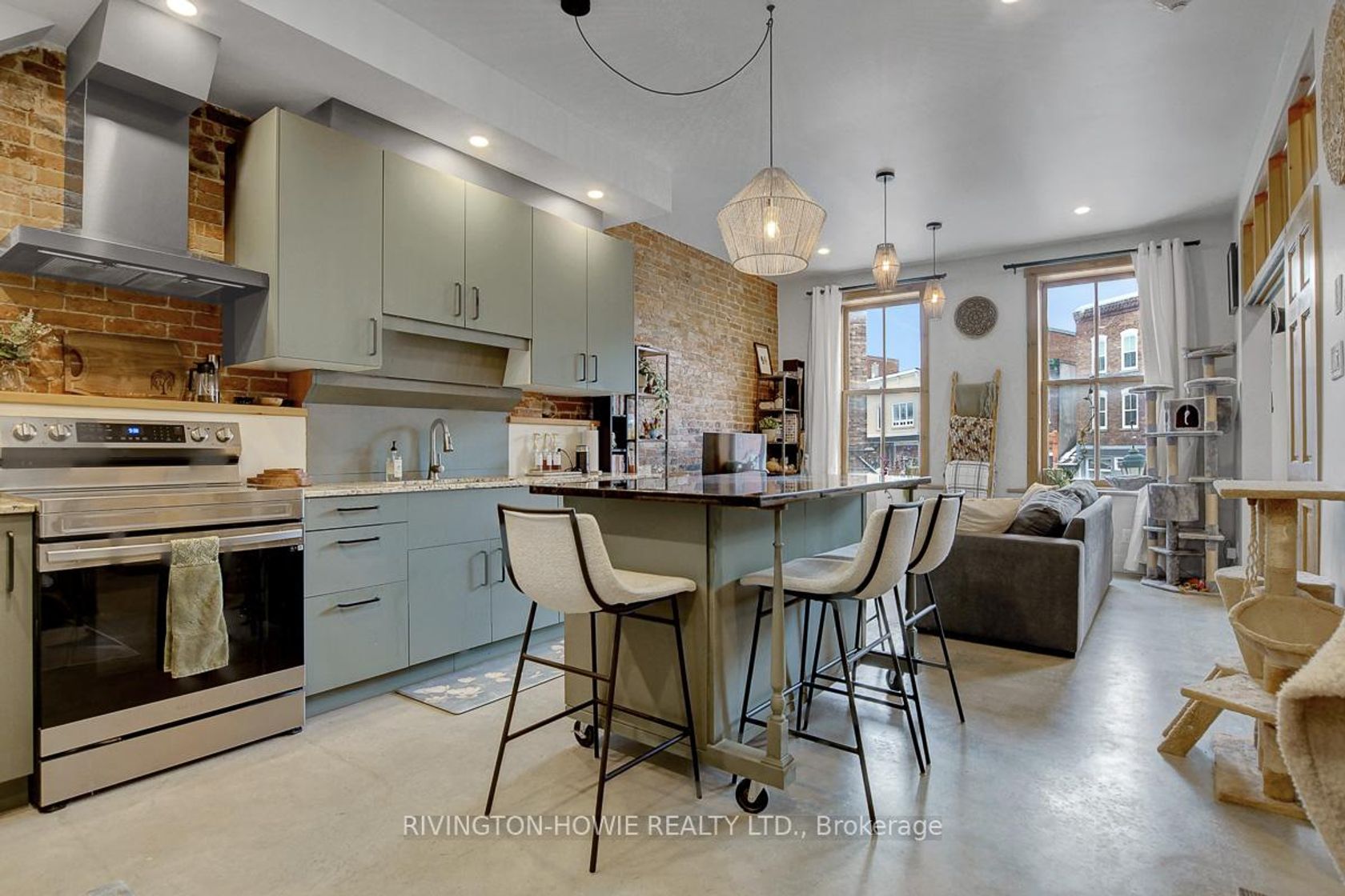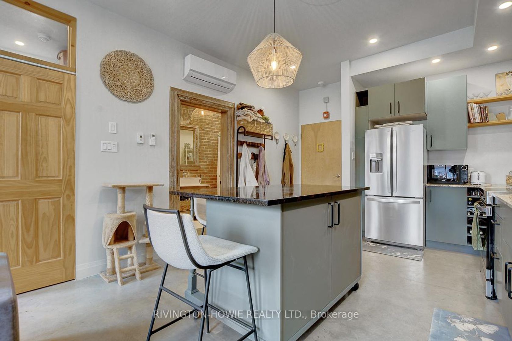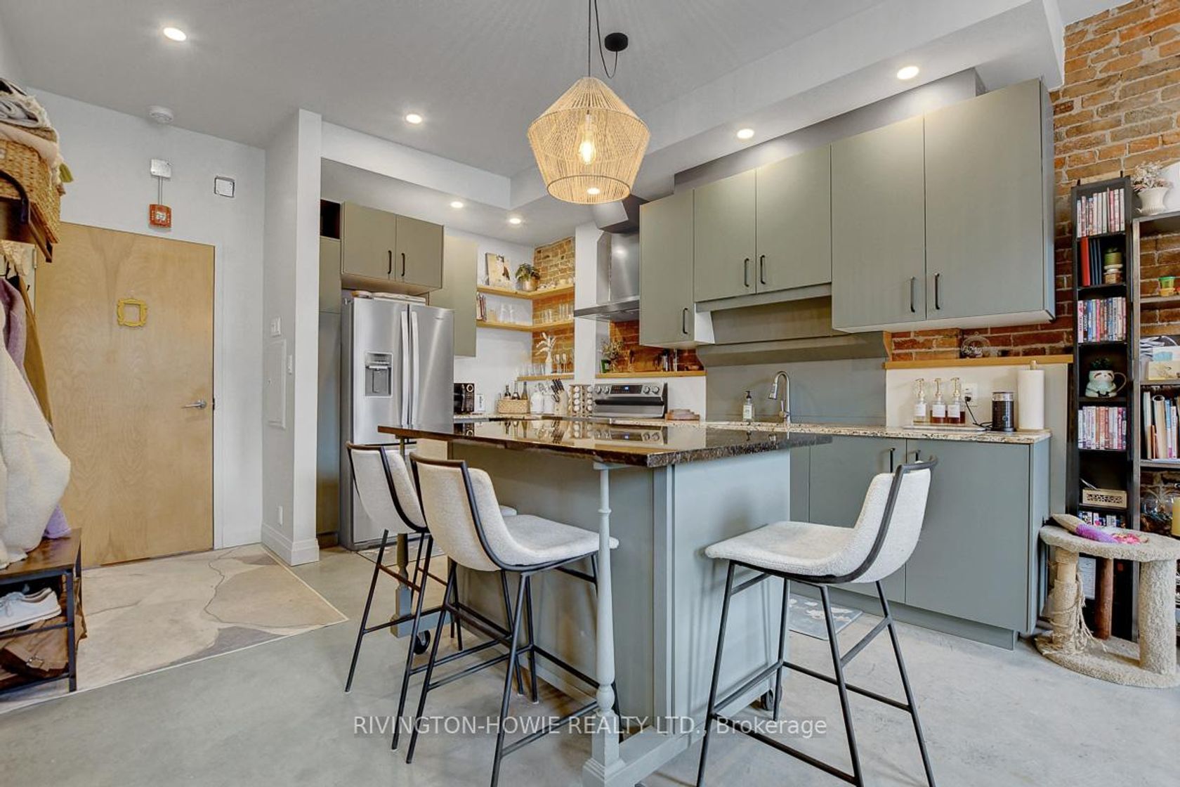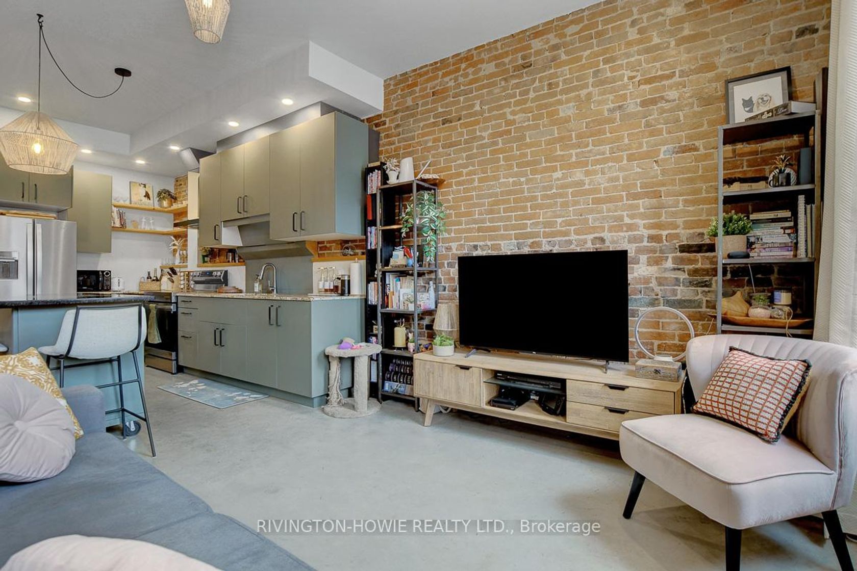 Welcome to 65 Mill Street, Unit 203 - where modern comfort meets historic charm in the heart of downtown Almonte. This beautifully designed 512 sq ft second-floor condo showcases exposed original brick, polished concrete floors, and soaring ceilings with recessed lighting, all complemented by picturesque street views. The kitchen is both stylish and functional, featuring granite counters, stainless steel appliances, ample cabinetry, open shelving, and a large central island with breakfast bar seating-perfect for everyday living and entertaining. The bright bedroom offers sliding barn-style doors for added privacy, while the 4-piece bathroom blends contemporary finishes with warm, rustic elements, complete with a soaker tub/shower, vessel sink, and sleek fixtures. In-suite laundry, air conditioning, and radiant in-floor heating add to the comfort and convenience. Enjoy the unbeatable location-just steps to Almonte's vibrant main street, with its fantastic restaurants and pubs, local bakery, butcher shop, and unique specialty stores. An excellent opportunity for first-time buyers, downsizers, or investors seeking a stylish, low-maintenance condo in a walkable and highly desirable community. This is the perfect place to call HOME!