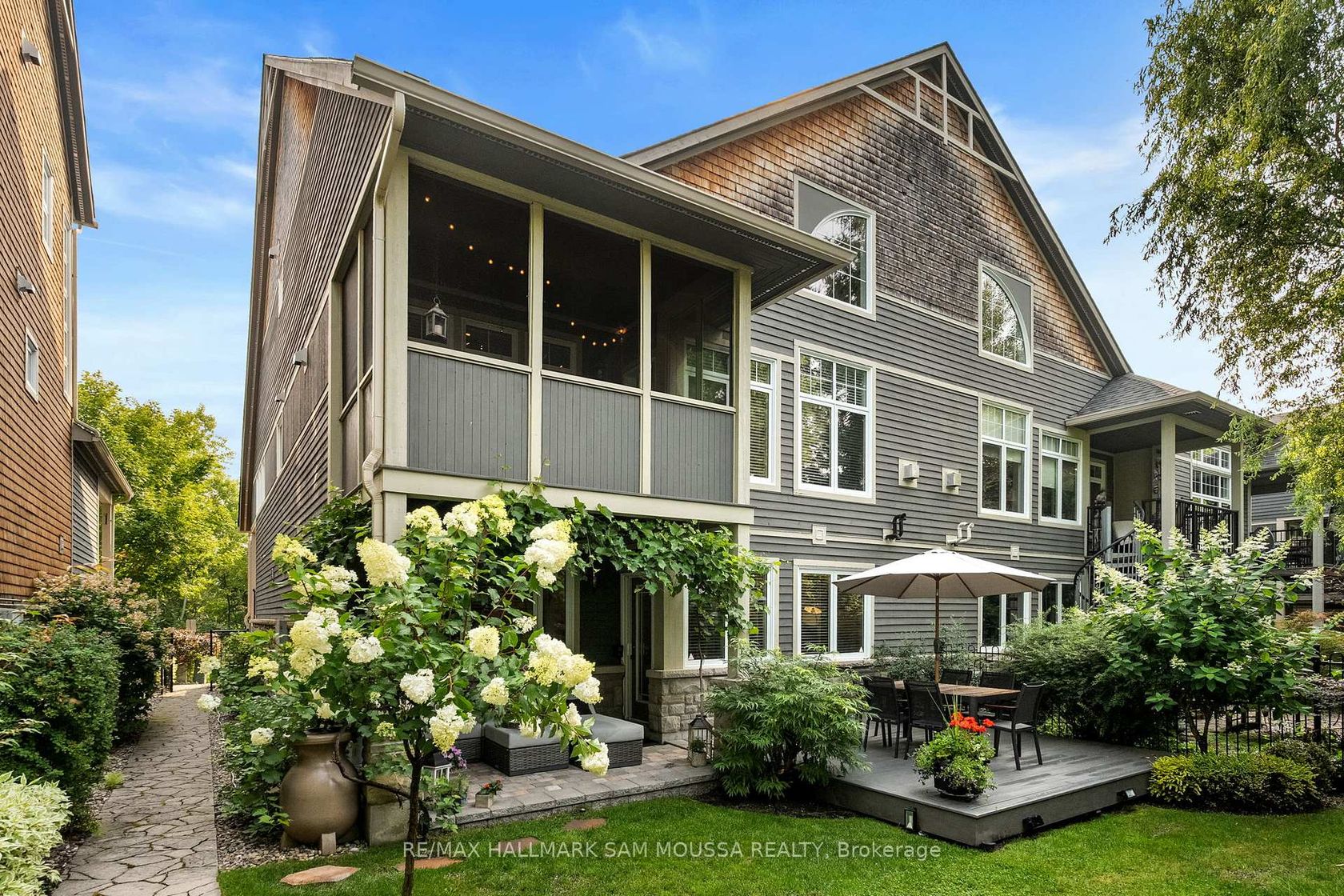 Tucked away in the sought-after enclave of Marshes Village, this beautifully upgraded end-unit townhome offers refined living. Thoughtfully maintained and tastefully enhanced. A foyer with Italian tile sets the tone, opening to open-concept living and dining spaces. Soaring ceilings, expansive windows, and a stone fireplace create a warm atmosphere. The kitchen is a standout, granite counters, stainless steel appliances, and generous cabinetry, all designed with beauty and practicality in mind. A dedicated office, renovated powder room, and laundry area enhance the main level. Off the main living area, a screened-in porch with a gas hookup for BBQ overlooks the back garden. The primary suite is a true retreat, with a large custom walk-in closet and a stunning spa-inspired ensuite. Upstairs, a versatile loft with two closets and a full bath provides flexible living space, ideal for a guest suite or reading nook. Oak hardwood flooring runs throughout, including all three staircases. The finished walk-out lower level offers even more flexibility with a second family room, a spacious bedroom overlooking the garden, a walk-through closet, and a beautifully renovated full bath. This level also features floating oak flooring, adding to the comfort throughout. Outside, professional landscaping enhances the front and rear gardens, a large cedar deck and elegant stone patio provide the perfect backdrop for outdoor entertaining. Recent upgrades include new roof tiles and new wooden front steps. Situated next to the prestigious Marshes Golf Course and just minutes from Kanata Norths high-tech hub, the Brookstreet Hotel, DND, the 417, local shops and restaurants, the Richcraft Rec Complex, and nearby pickleball courts, this home offers a luxurious lifestyle in one of the city's most exclusive communities. Marshes Village Homeowners Association fee is $196/month covers road snow removal, landscaping, general maintenance, audit and insurance with a reserve fund for future needs.